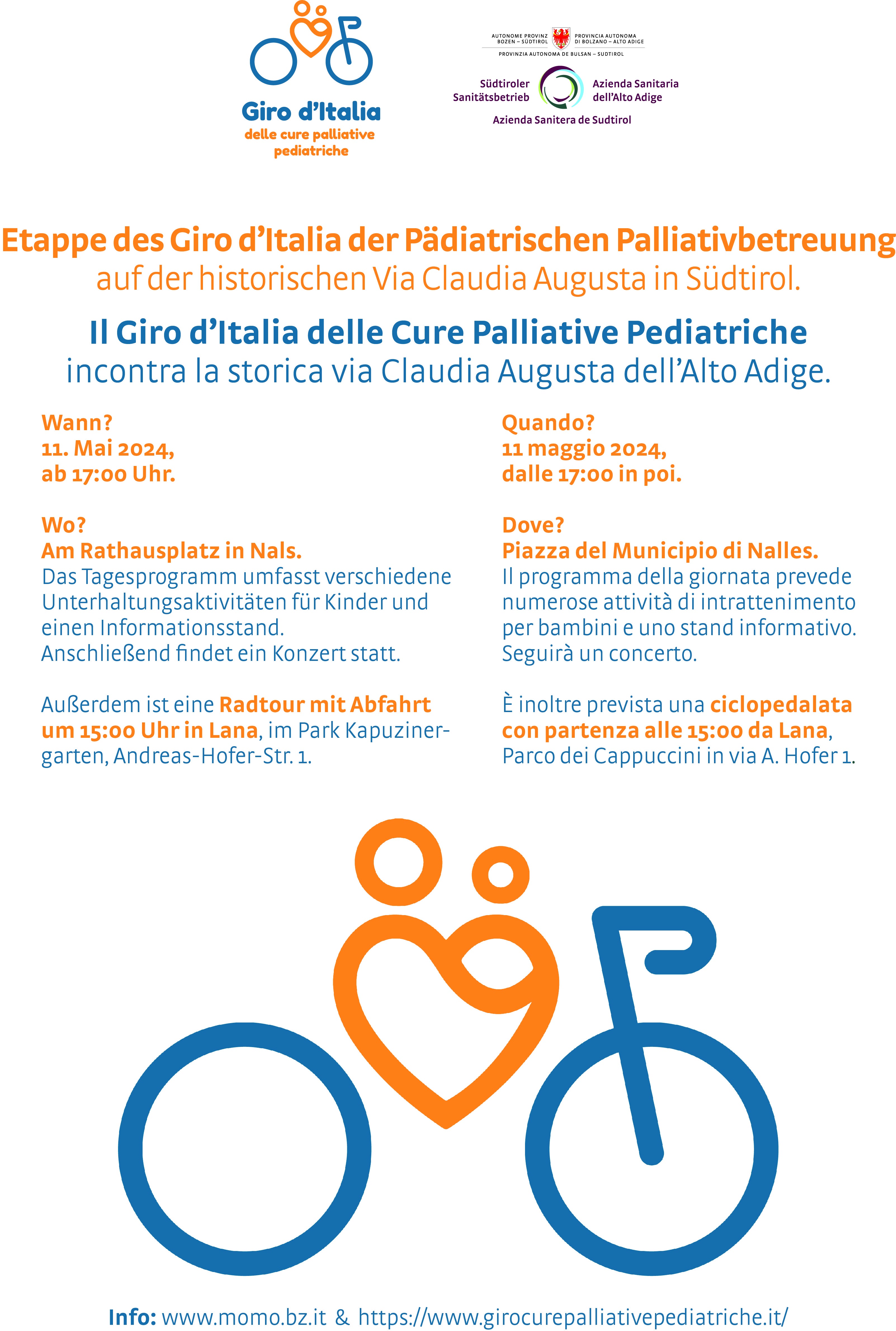 Die erste Etappe des „Giro d’Italia der Pädiatrischen Palliativbetreuung“ hat ihren Start in Südtirol. Zu diesem Anlass sind vielfältige Aktivitäten nicht nur für Familien, sondern für alle interessierten Personen, organisiert worden, unter anderen eine Radtour, ein Unterhaltungsprogramm, ein Informationsstand und ein Abschlusskonzert.