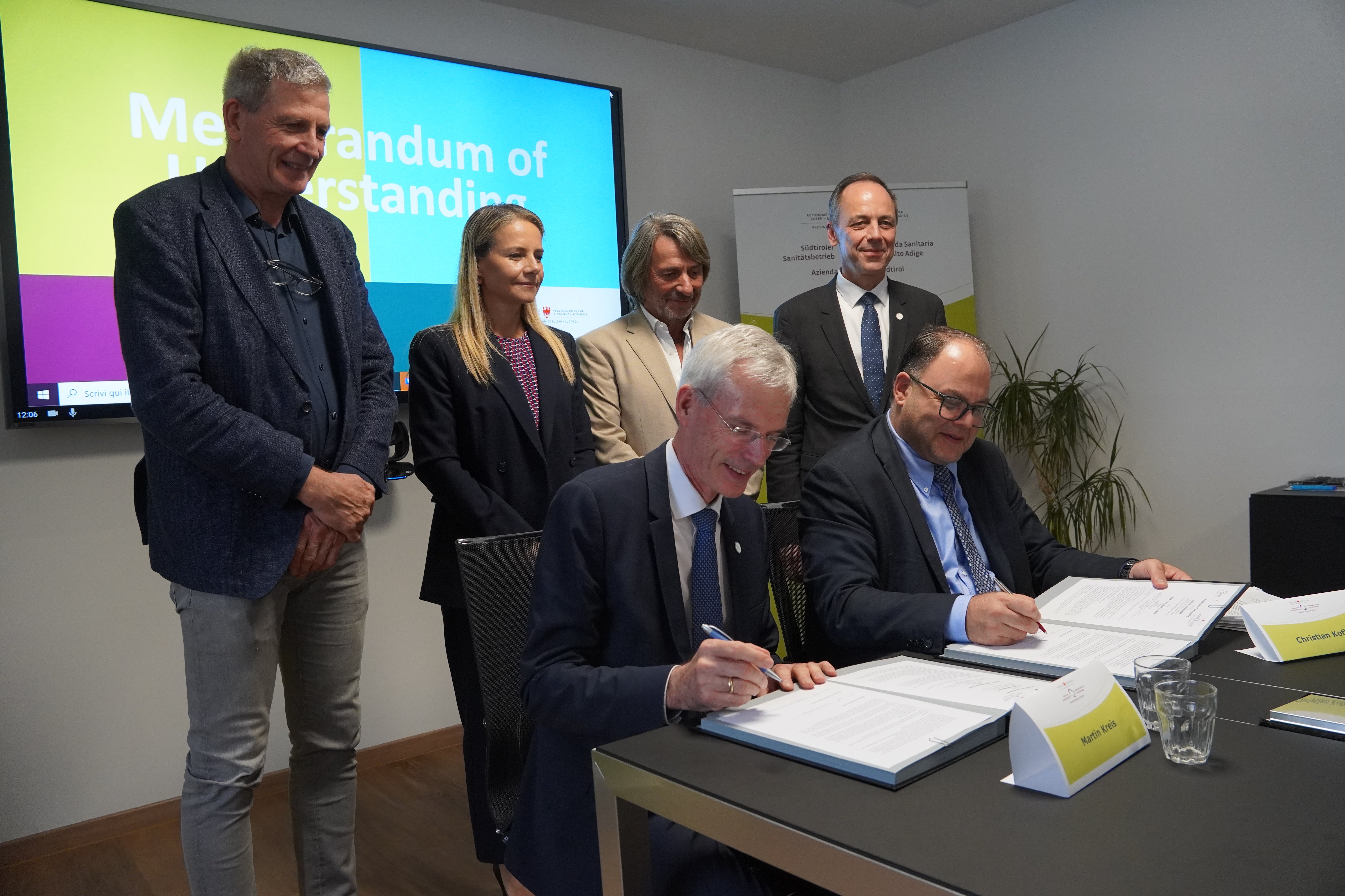 Die Zusammenarbeit mit dieser renommierten Klinik stellt eine große Chance für den Südtiroler Sanitätsbetrieb dar und kommt nicht zuletzt den Patientinnen und Patienten zugute. Der Wille zur Kooperation zwischen Sanitätsbetrieb und Charité sowie die Zielsetzungen und Themen sind in einem „Memorandum of Understanding“ festgehalten. Dieses ist nun am Donnerstag, den 3. Oktober 2024, von Vertretern des Südtiroler Sanitätsbetriebes und Vertretern der Charité - die dazu eigens aus Berlin nach Bozen angereist waren - im Beisein der Medien unterzeichnet worden.