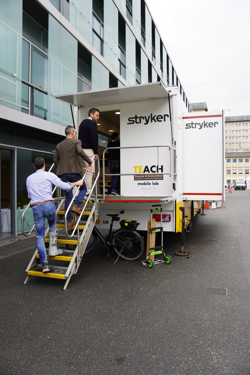 Der außergewöhnliche Schauplatz des theoretisch-praktischen Kurses war ein fahrender "Truck", der vor dem Klinikgebäudes des Landeskrankenhauses Bozen geparkt war und in dem die Kursteilnehmerinnen und Kursteilnehmer die Möglichkeit hatten, chirurgische Techniken zur Behandlung von Frakturen an Kunstknochen unter Verwendung von geläufigen Instrumentarien und Osteosynthesematerialien zu erlernen und in die Praxis umzusetzen.