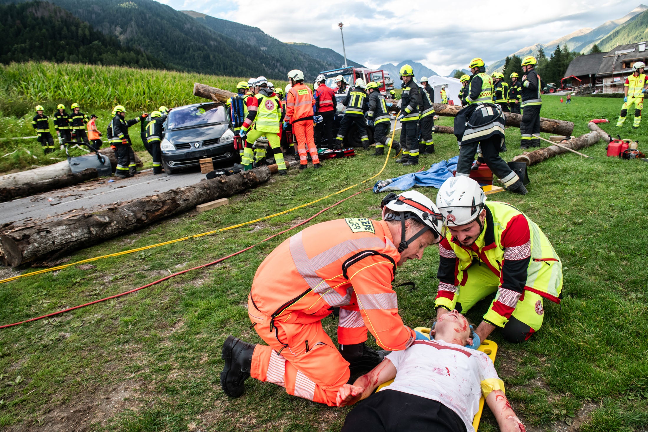 Angenommen wurde ein schwerer Verkehrsunfall auf der Landesstraße zwischen Niederrasen und Oberrasen. Das Szenario: Ein Holztransporter hat mehrere Baumstämme verloren, die dann ein Fahrzeug getroffen und die Insassen verletzt haben. Aufgrund der Unfalldynamik ist die Fahrbahn vollständig blockiert. Damit ist ein Abtransport der Verletzten auf dem üblichen Weg nicht möglich und die Einsatzkräfte müssen alternative Transportwege organisieren.